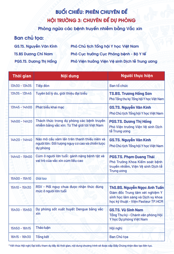 - Nội dung: 01 Phiên toàn thể, 03 Phiên chuyên đề (chính sách, ung thư, dự phòng), 01 Phiên hội thảo vệ tinh